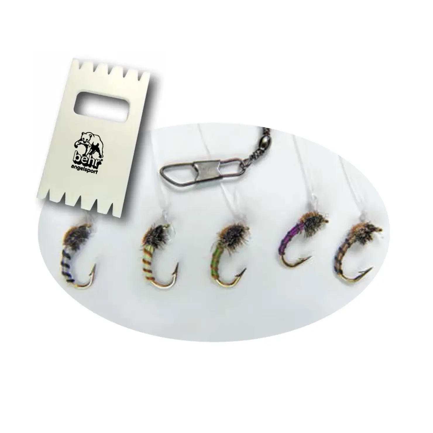 Die verwendeten Nymphen sind ihren natürlichen Vorbildern nachempfunden. Die koreanischen High-Tech Haken überzeugen durch chirurgische Schärfe. Bei dieser von Meisterhand gebauten Hegene ist jede einzelne Nymphe mit einem speziellen Schlaufenknoten gebunden, was in der Praxis eine natürliche Köderpräsentation bedeutet.
