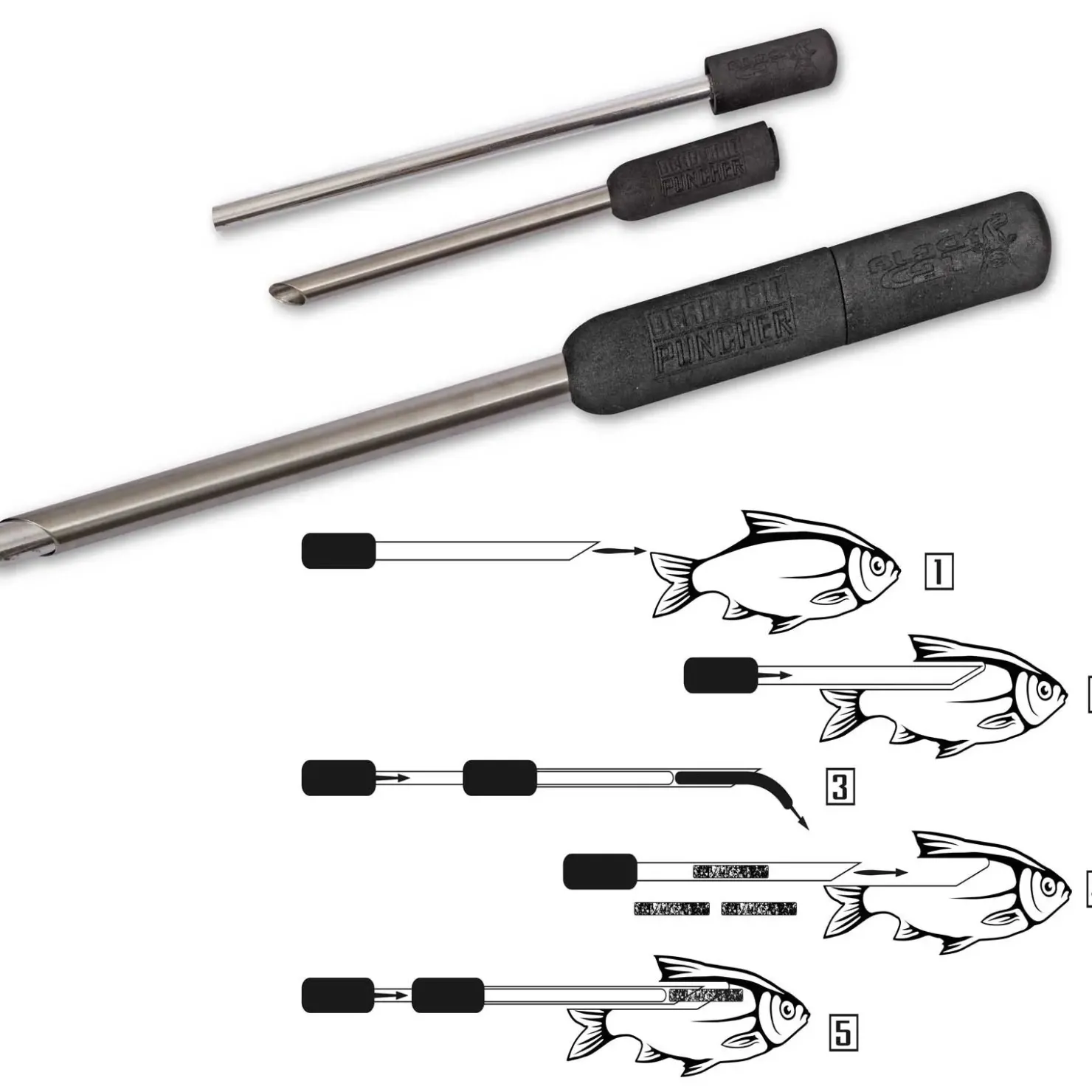 Das scharfkantige, seitlich angeschränkte Einschubrohr dringt messerscharf in den Rücken der Köderfische ein und entnimmt durch leichtes Drehen des Punchers ein Stück Rückenfilet. In den entstandenen Hohlraum des Köderfisches können nun Dead Bait Sticks oder Kork Sticks eingeschoben werden und verleihen dem Dead Bait natürlichen, waagerechten Auftrieb. In der Strömung beginnt der tote Köderfisch sehr realistisch zu schwimmen und überzeugt jeden Flusswaller.