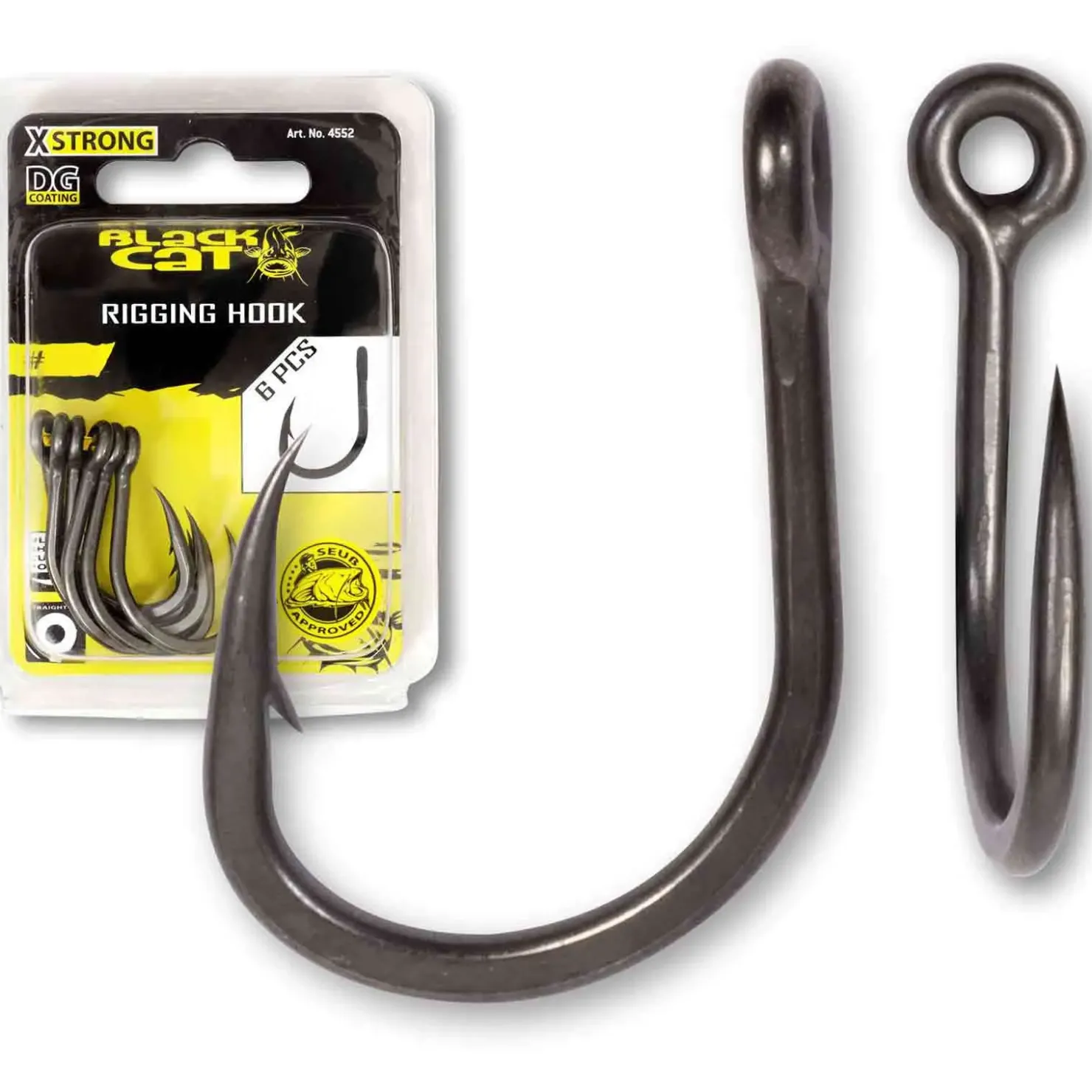Der Black Cat Rigging Haken DG ist ein gnadenlos starker Einzelhaken. Sein Körper ist aus starkem Stahl geformt, das verschweißte Öhr groß genug, damit auch dickes, monofiles Vorfach durchpasst. Die lange Spitze dieses Wallerhakens ist enorm scharf. Der Black Cat Rigging Haken DG kommt überall dort zum Einsatz, wo es extrem wird. In Spanien beim Angeln im Holz oder in Italien beim festen Umlenken in der Steinpackung, hier fühlt sich der Rigging Haken wohl. Aber auch super als Haltehaken an der Haarmontage.