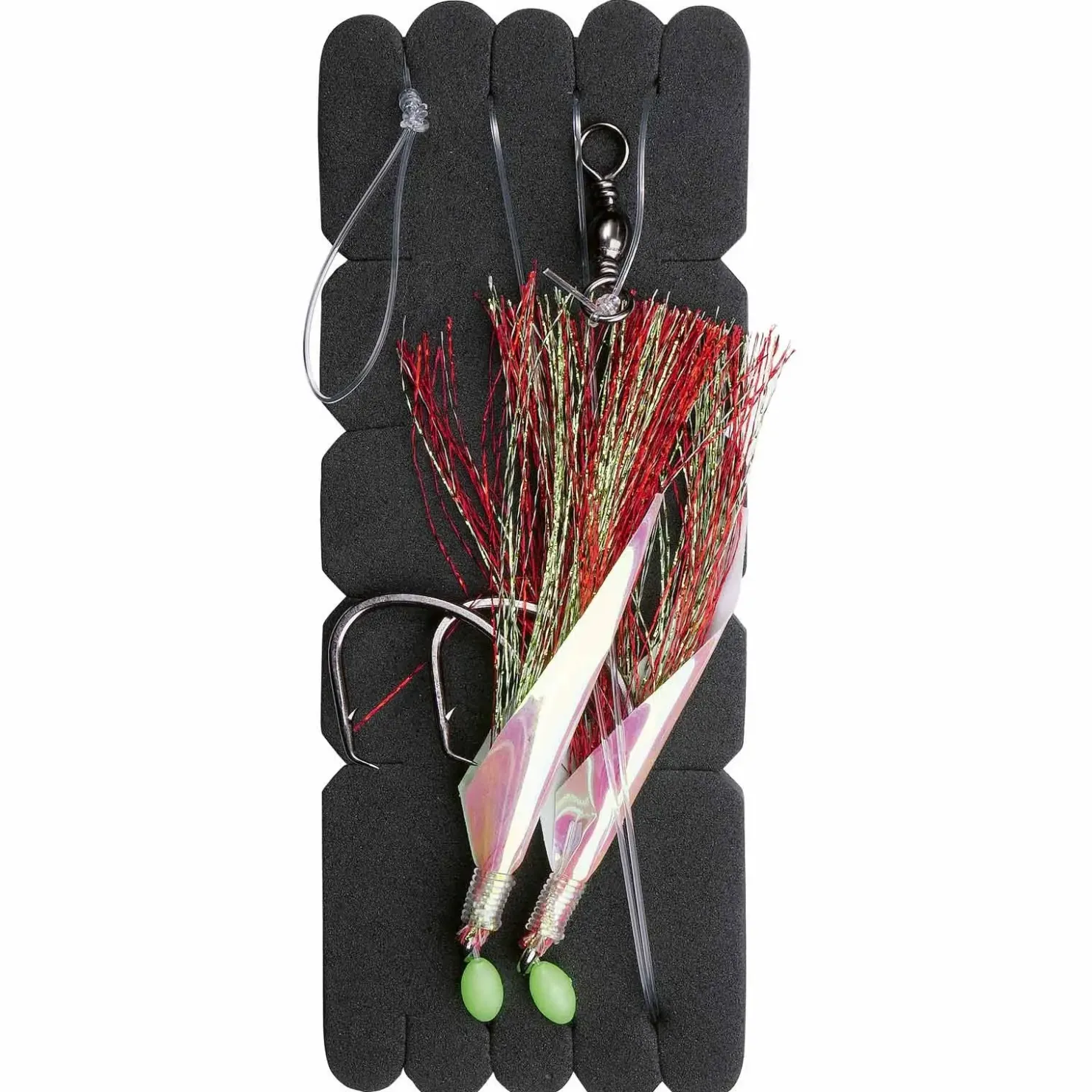 MERKMALE: Beinhaltet 1 fix und fertig montiertes Großfisch-Rig mit 2 Ködern und Circle-Haken, Lockperlen & Wirbel. Die starke Vorfachschnur verfügt über eine Abriebfestigkeit.