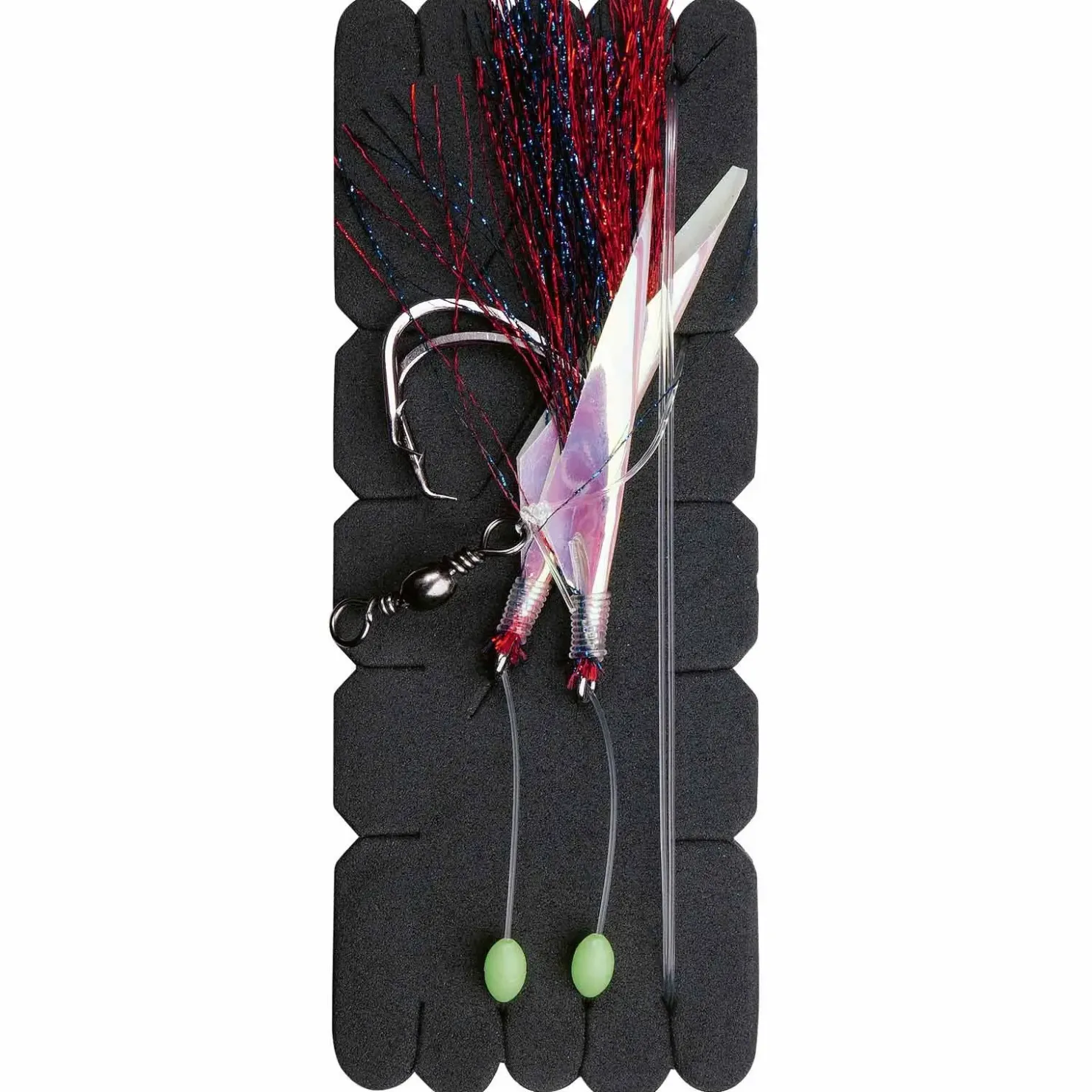 MERKMALE: Beinhaltet 1 fix und fertig montiertes Großfisch-Rig mit 2 Ködern mit Circle-Haken, Lockperlen & Wirbel. Die starke Vorfachschnur verfügt über eine Abriebfestigkeit.