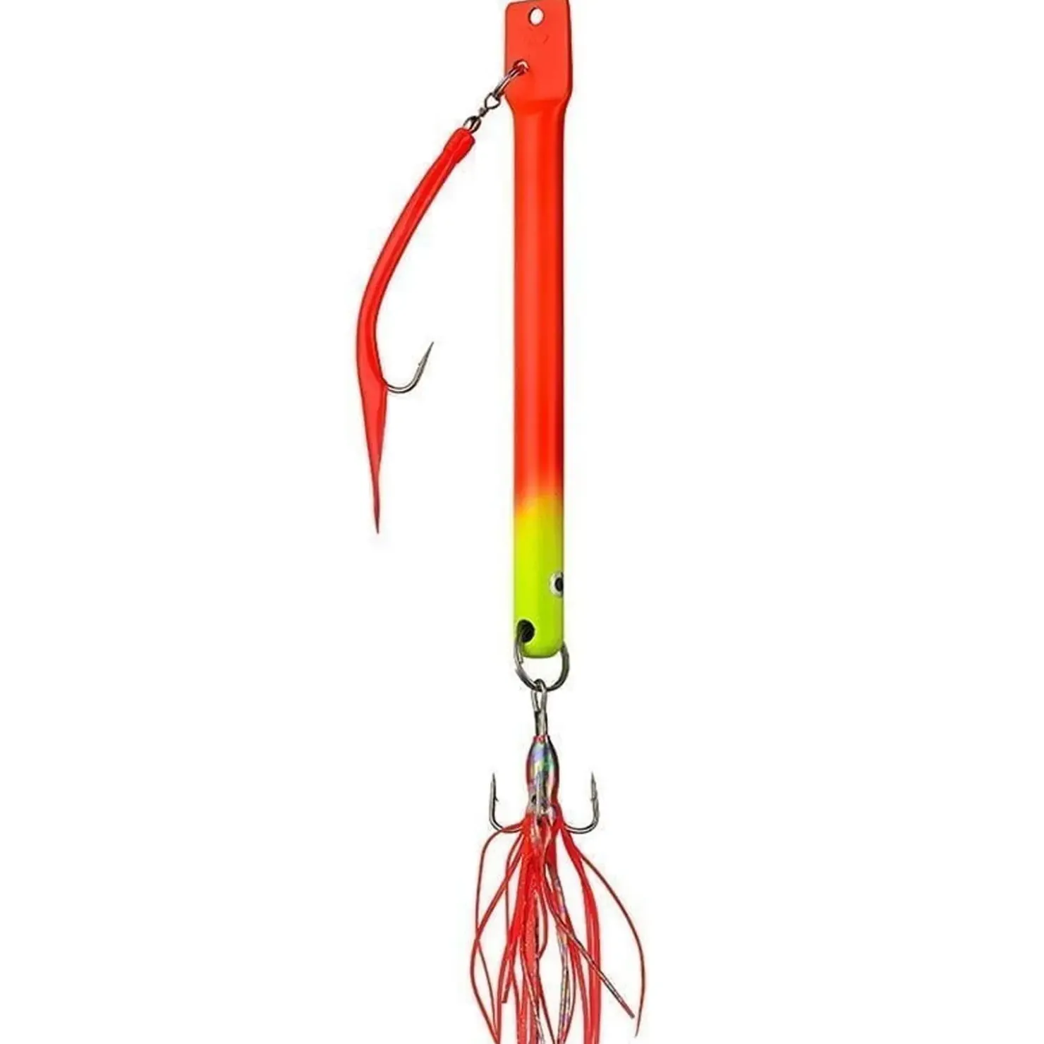 Dieser geniale Pilker ist mit einem Makk und einem kleinen Oktopus am Haken ausgestattet. Das Resultat ist ein Feuerwerk an Schlüsselreizen. Dorsch, Seelachs, Heilbutt und Co. regieren auf diese Reize häufig mit harten Attacken. Auf Grund seiner schlanken Form sinkt der Pilker sehr schnell ab und lässt sich selbst bei starker Drift noch sehr gut führen.