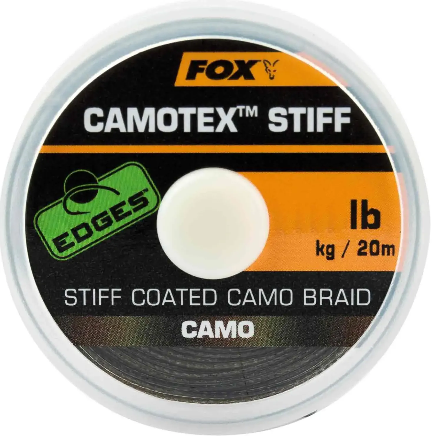 Das Fox Camotex Stiff Coated Camo Braid besteht aus einem weichen, sinkenden Geflechtkern in Tarnfarbe und einer sehr steifen, matten Außenbeschichtung. Die Schnur kann mit heißem Wasserdampf sehr gut gestreckt werden.