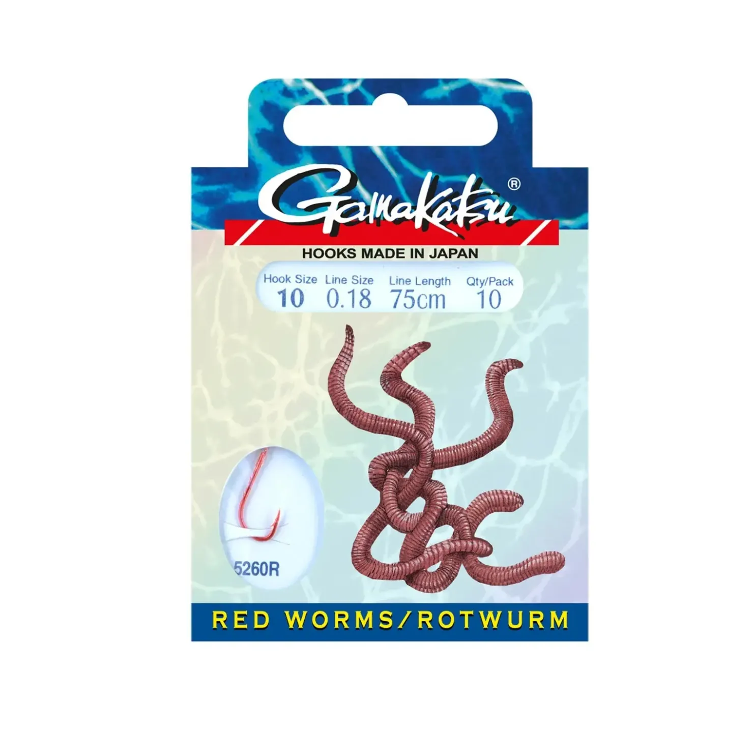 Die Gamakatsu Wurm 5260R Vorfachhaken in Profiqualität sind an die starke G-Line gebunden. Die nadelscharfe Spitze sorgt für einen sicheren Anhieb.