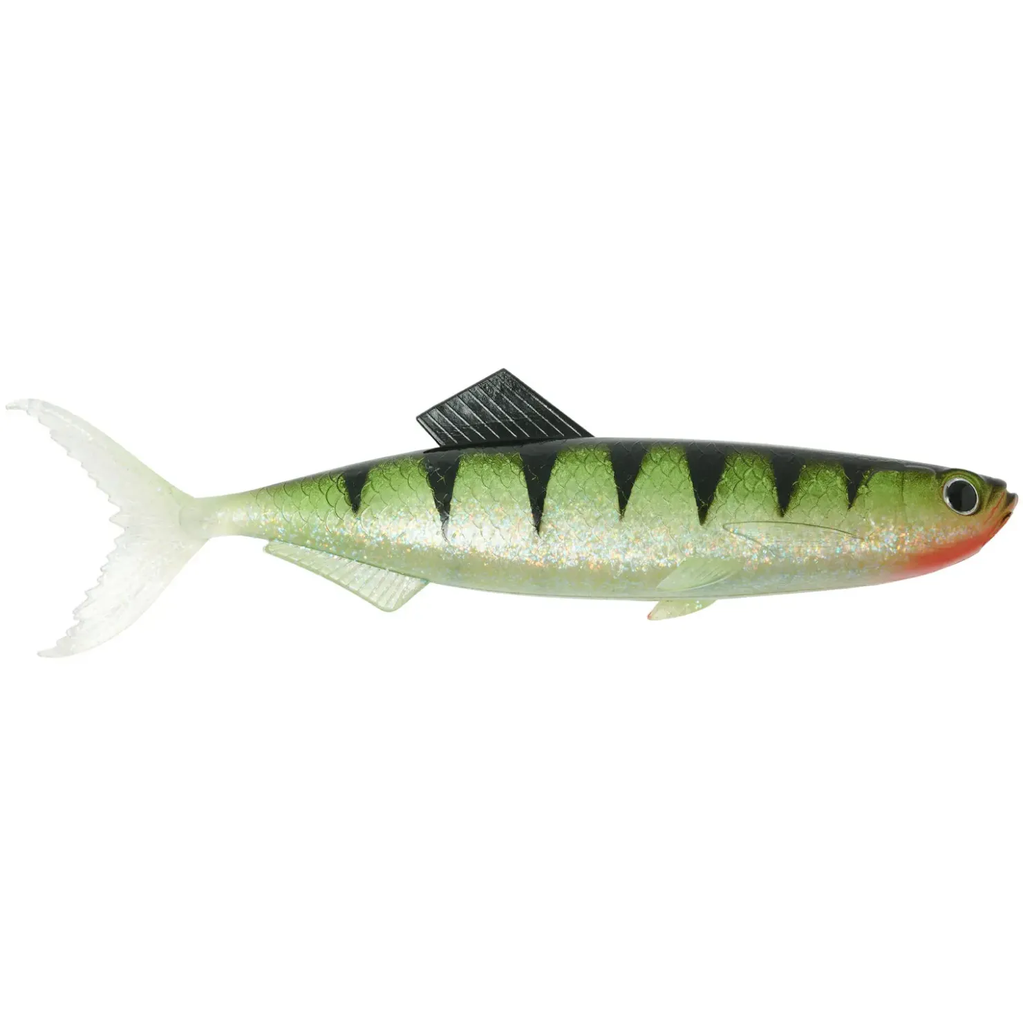 Mit dem voluminösen Körper und dem breiten V-Schwanz erzeugt dieser Köder eine auffällige Präsenz unter Wasser, was die Aufmerksamkeit der Räuber durch ihre Seitenlinien anspricht.