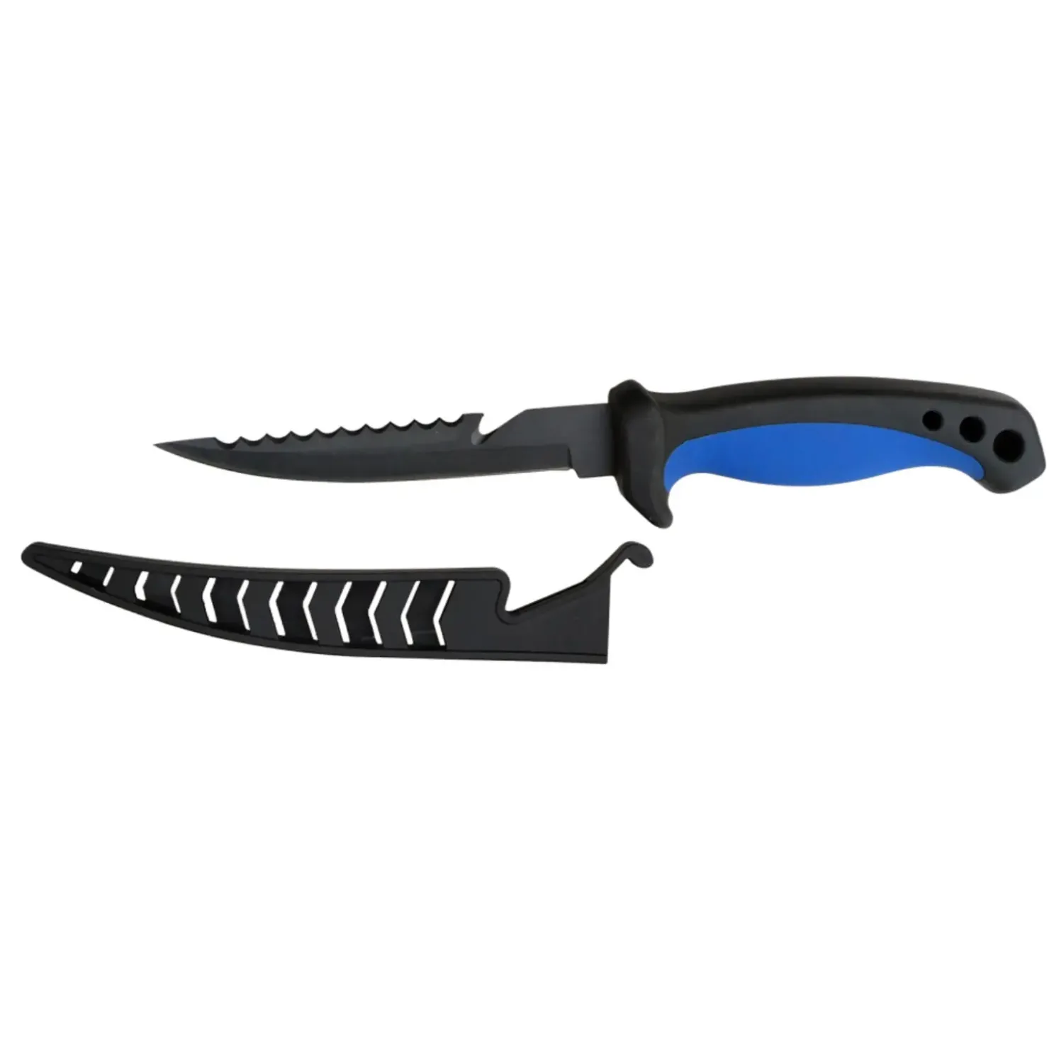 Hochwertiges, beschichtetes Angelmesser mit Fischschupper. Ausgestattet mit ergonomisch geformtem, rutschfestem Griff.