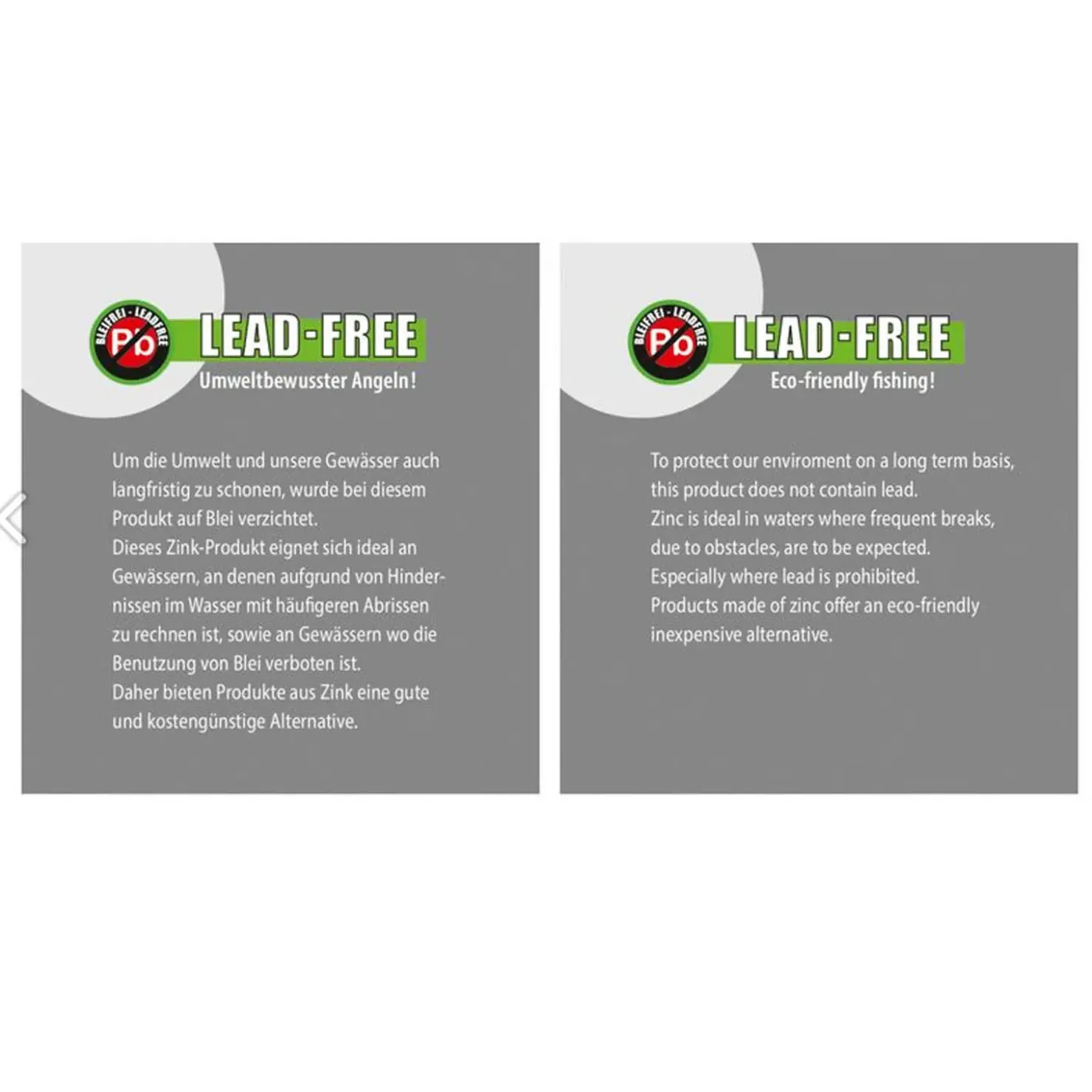 Um die Umwelt und unsere Gewässer auch langfristig zu schonen, wurde bei diesen Produkten auf Blei verzichtet. Diese Zink-Produkte eignen sich ideal an Gewässern, an denen aufgrund von Hindernissen im Wasser mit häufigeren Abrissen zu rechnen ist, sowie an Gewässern wo die Benutzung von Blei verboten ist. Daher bieten Produkte aus Zink eine gute und kostengünstige Alternative.