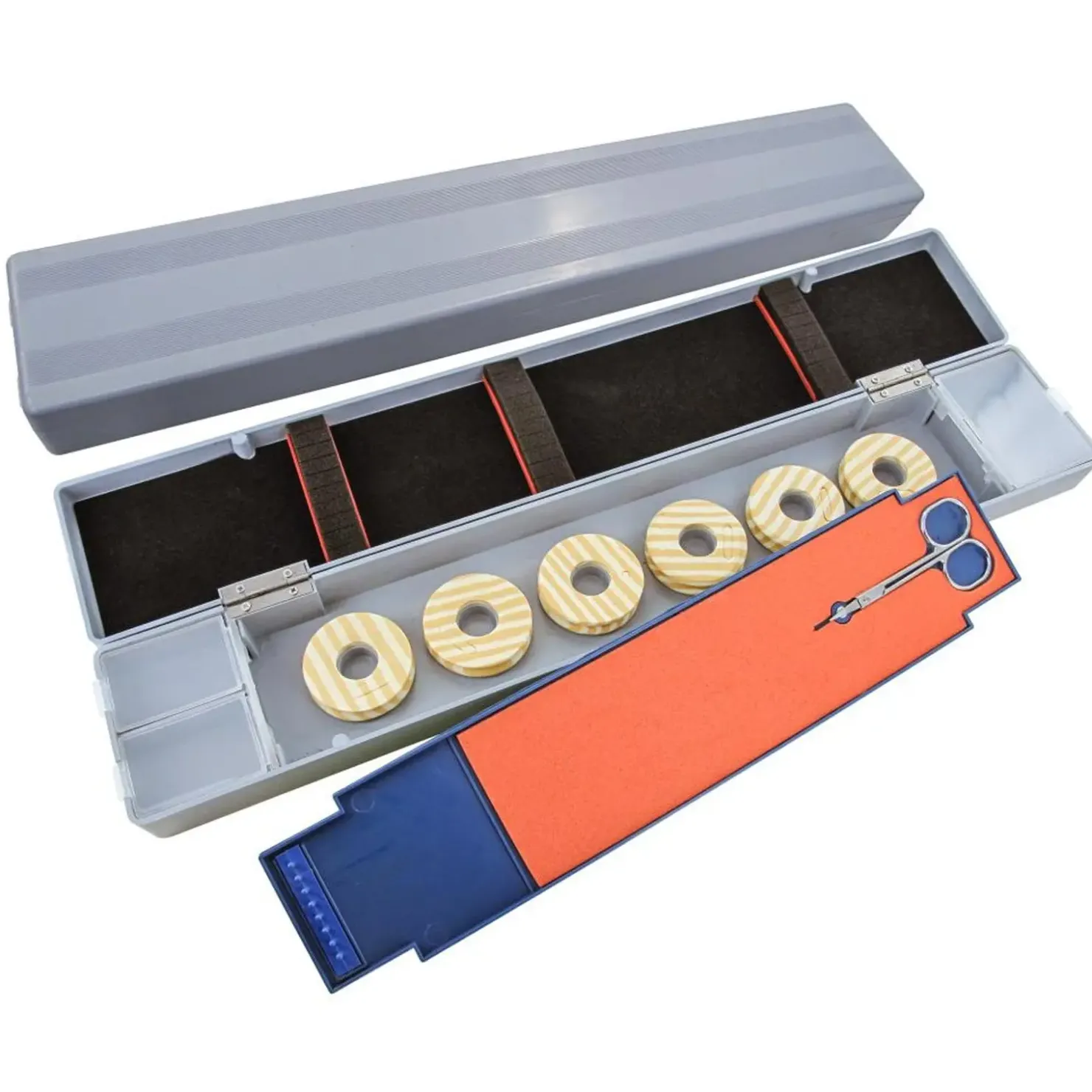 Die Jenzi Kunststoff-Box 45×7,5x4cm mit Spulen und Schere ist eine praktische Box für Vorfächer, Hegenen und kleine Utensilien zum Vorfachbau.