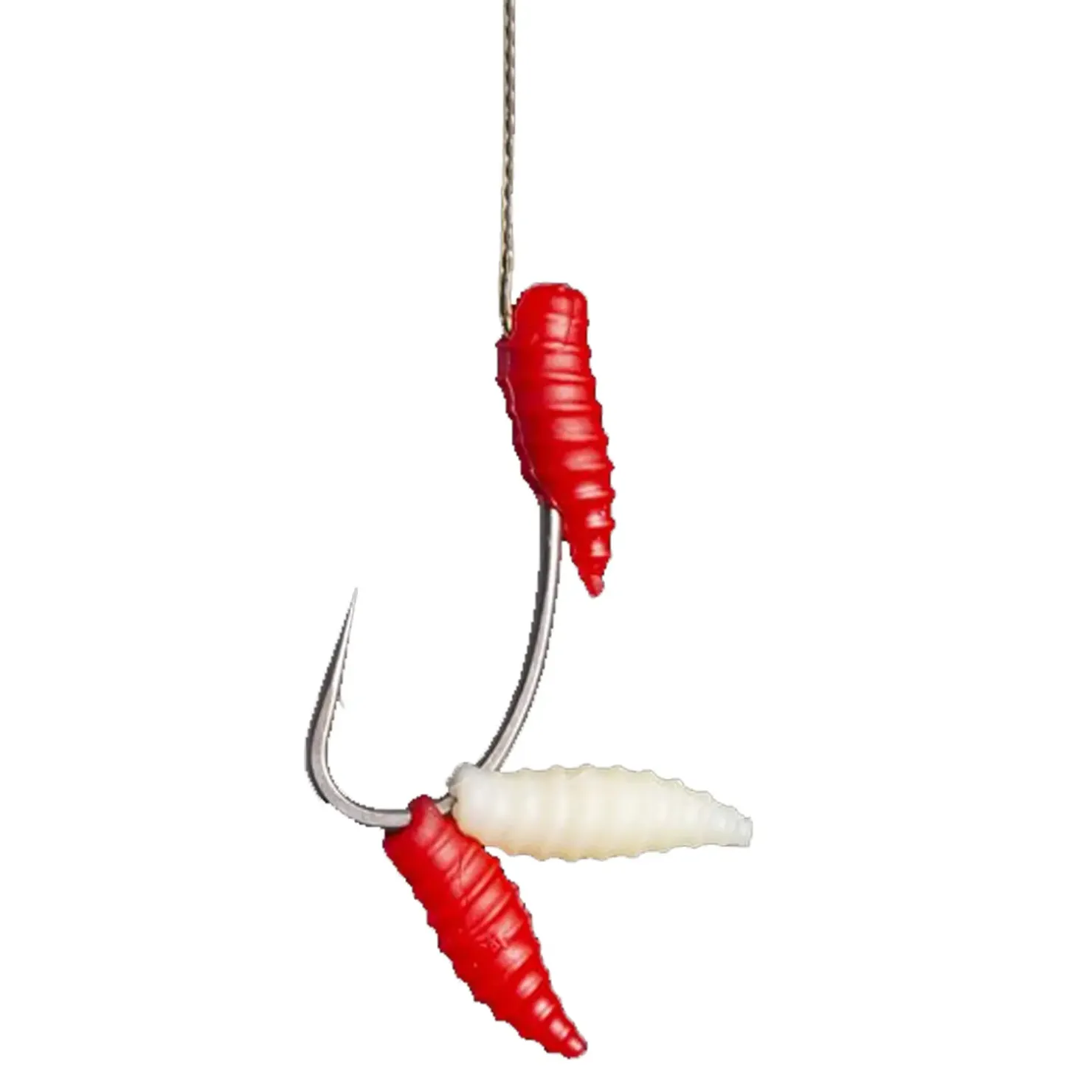 Verwende am Anfang und am Ende eines Maden-Bündels eine Plastik Made, wenn du echte Maden auf Bait Floss oder auf dünne Schnur auffädeln willst, um zu verhindern, dass diese beim Verknoten aufplatzen.