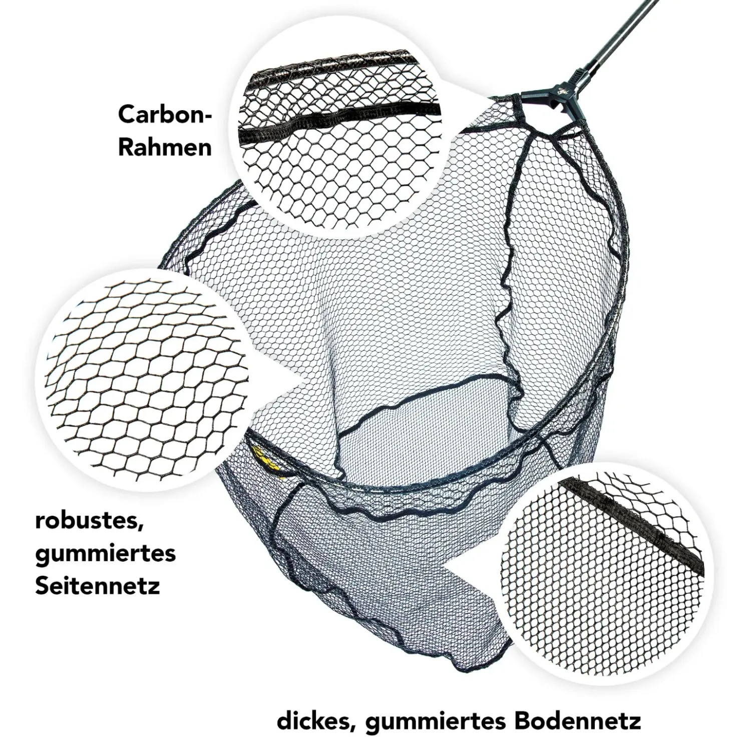 - Bodennetz: gummiert, feinmaschig, geeignet zur schonenden Fischablage