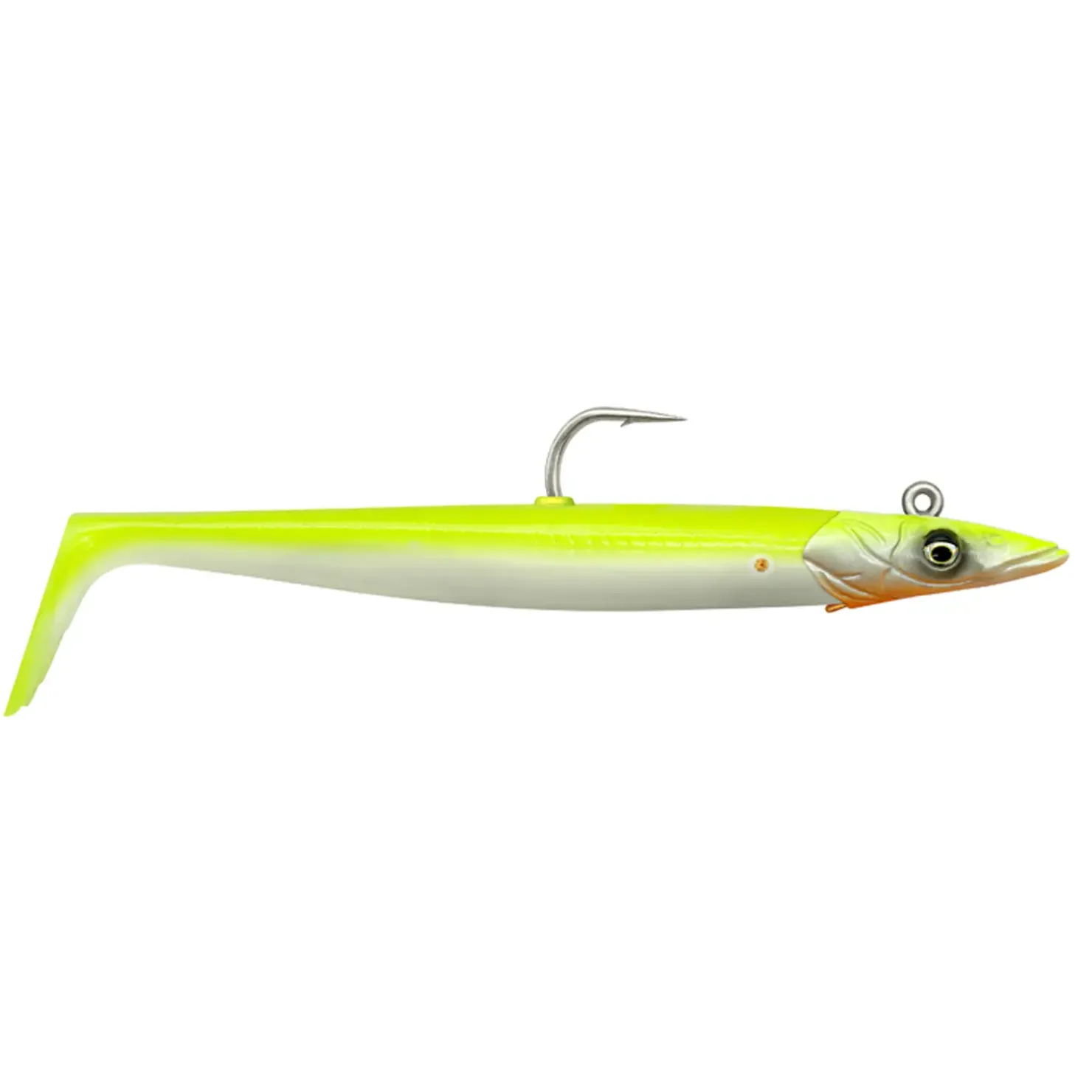 Der im Lieferumfang enthaltene Rise & Stand Up-Jigkopf sorgt für ein aufreizendes Laufverhalten. Der Sandeel V2 steigt bei Zug auf und steht in der Ruhephase am Grund aufrecht.