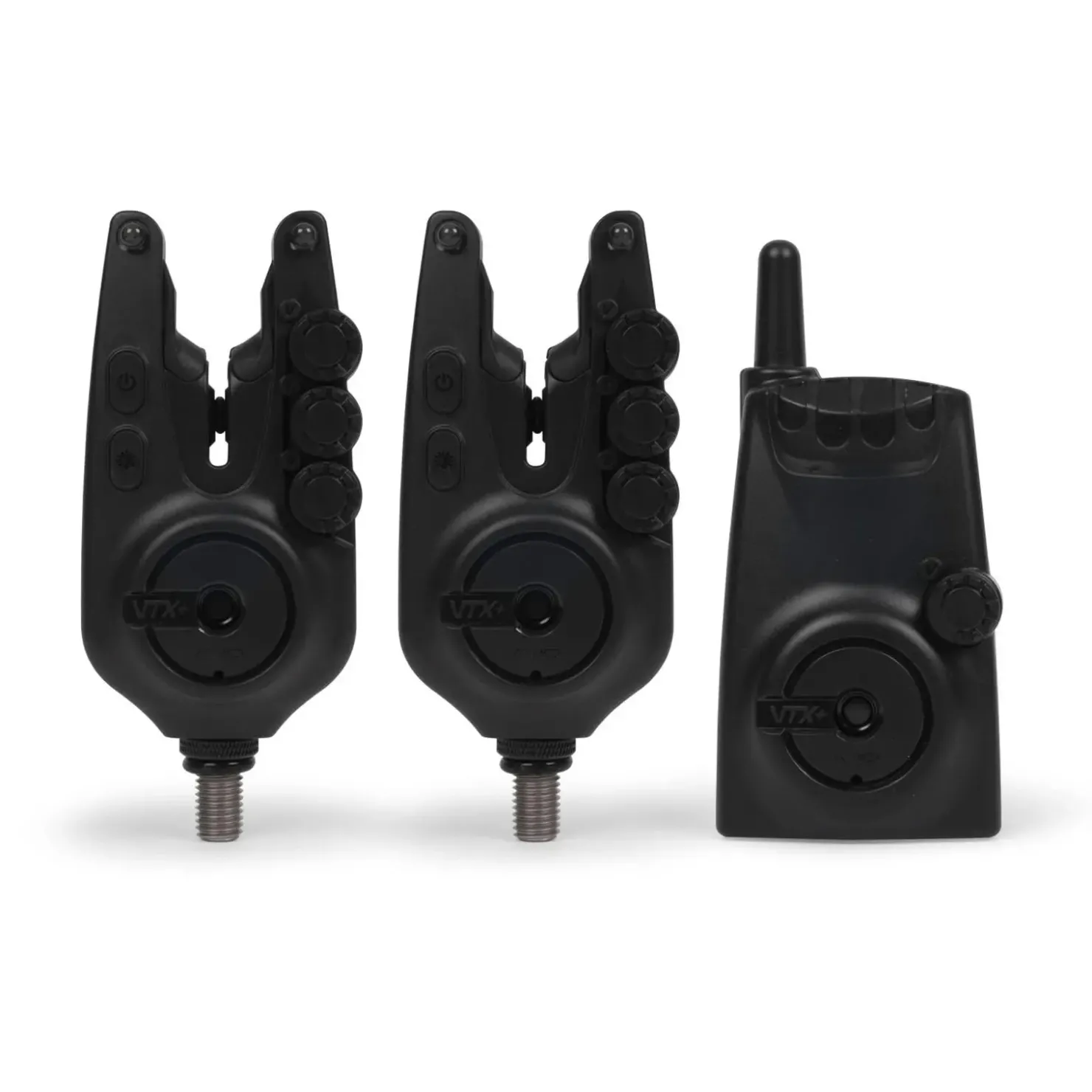 Das Avid VTX+ 2-Rod Bite Alarm Set enthält zwei Alarmköpfe und einen Empfänger, komplett mit Clip-on-Hardcases, Empfängerband und Schraubendreher.