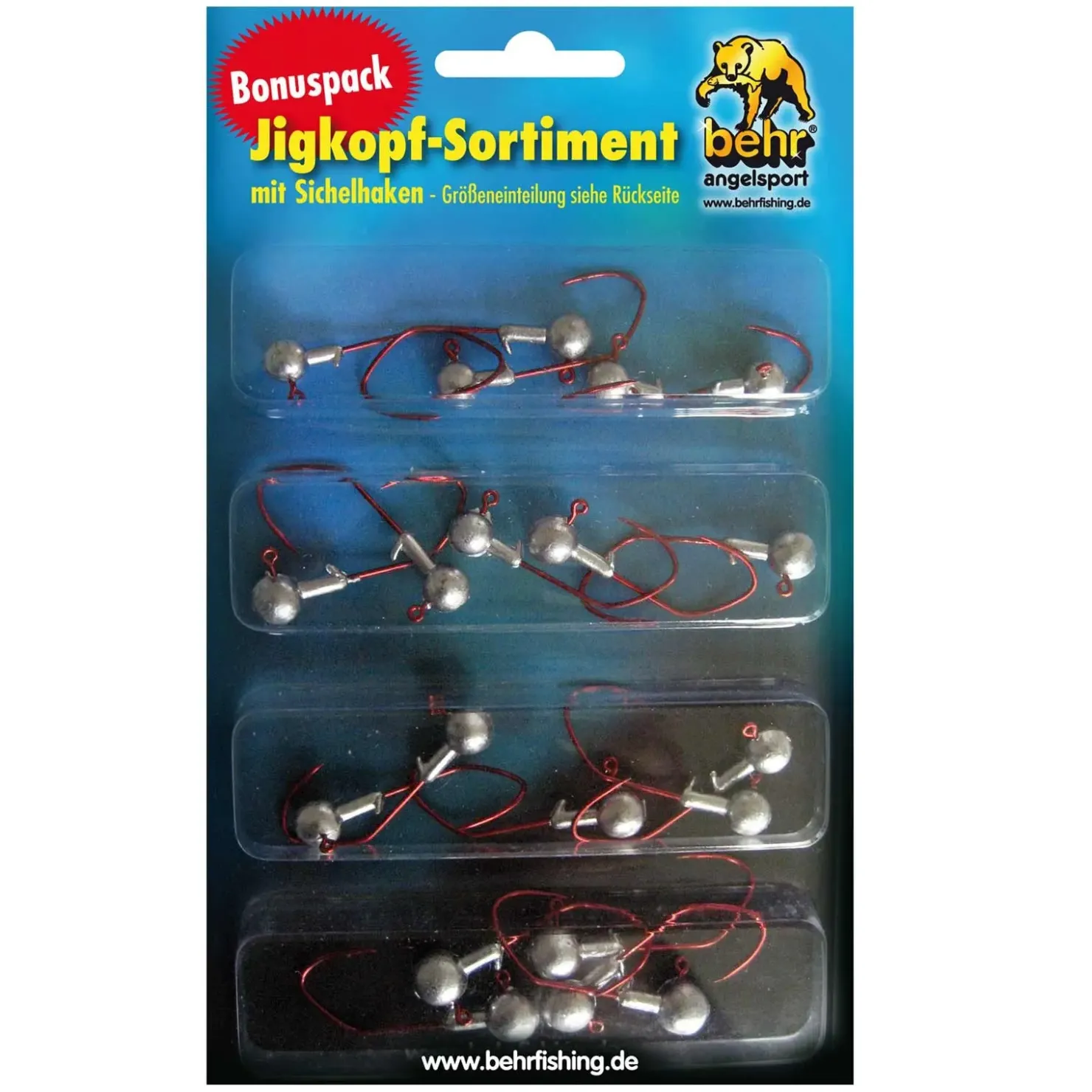 Merkmale Behr Jigkopf Set 3 20 Stück: Inhalt 20 Jigköpfe – Hakengröße 4/0 – Gewicht 3, 5, 7 und 9 Gramm – Hakenfarbe rot. Klassische Rundkopf-Form – Ausgelegt für Köderlänge von 10 bis 15 Zentimeter