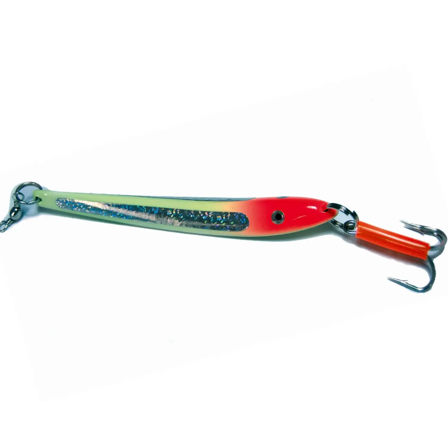 Nicht nur optisch ein Leckerbissen. Dieser selbstleuchtende Pilker mit Reflexstreifen beginnt bereits beim Ablassen mit seinem aufreizenden Spiel.