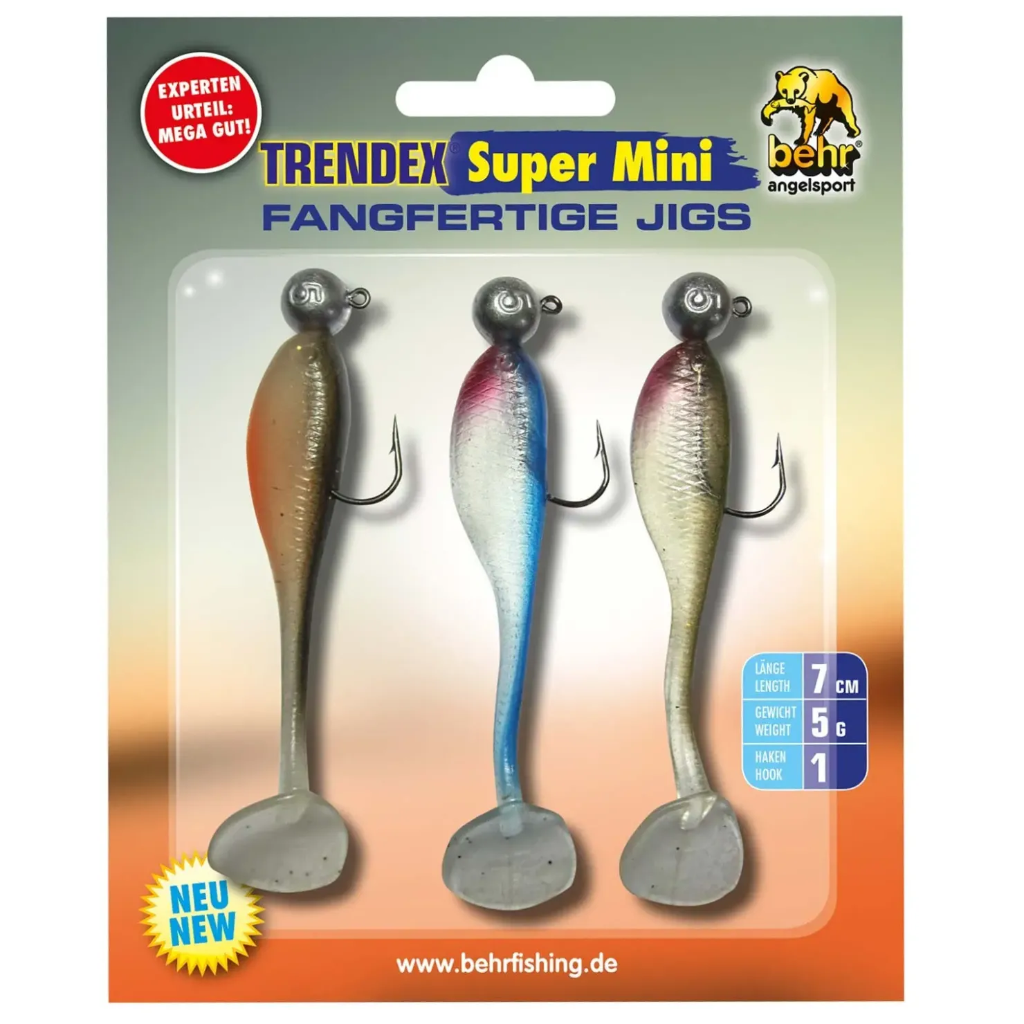 MERKMALE: 3 fertig montierte Gummifische. Zielfische sind Forelle und Barsch. Köderlänge 7 Zentimeter. Jigkopfgewicht 5 Gramm.
