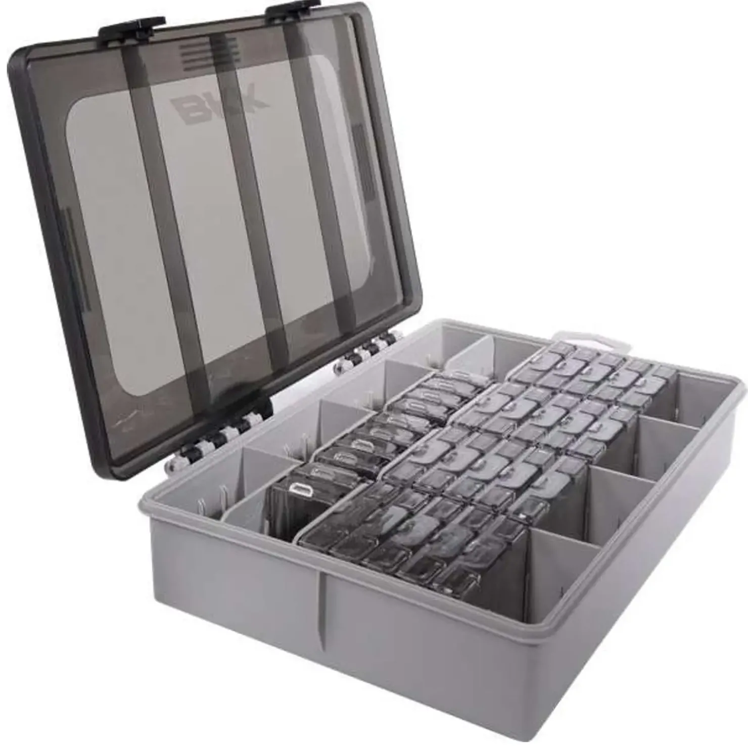 Die BKK Ocd Tackle System-A2 Loaded Haken-Box bietet Anglern einen Einstieg in das ultimative Tackle Management und sorgt dafür, dass einige Ihrer wertvollsten Gegenstände organisiert und sicher am Wasser aufbewahrt werden. Das Herzstück dieses Systems ist das OCD Tackle Storage Tray, das für die Unterbringung der kleinen und mittelgroßen Zubehörboxen konzipiert ist. Im Lieferumfang dieses Starterkits sind 8 kleine und 20 mittelgroße Zubehörboxen enthalten, die jeweils mit Etiketten zur einfachen Identifizierung versehen werden können. Zusätzliche Boxen können separat erworben und im Laufe der Saison entnommen werden, um verschiedene Techniken und Taktiken unterzubringen. Das OCD Tackle Tray ist aus strapazierfähigem Polypropylen gefertigt und verfügt über eine weiche Dichtung am Rand, die Wasser, Staub und andere Verschmutzungen fernhält. Starke Verschlüsse verhindern, dass Ihr Angelgerät und sonstiges Zubehör durcheinander gerät, und sorgen dafür, dass die Dichtung am Rand der Box dicht hält.