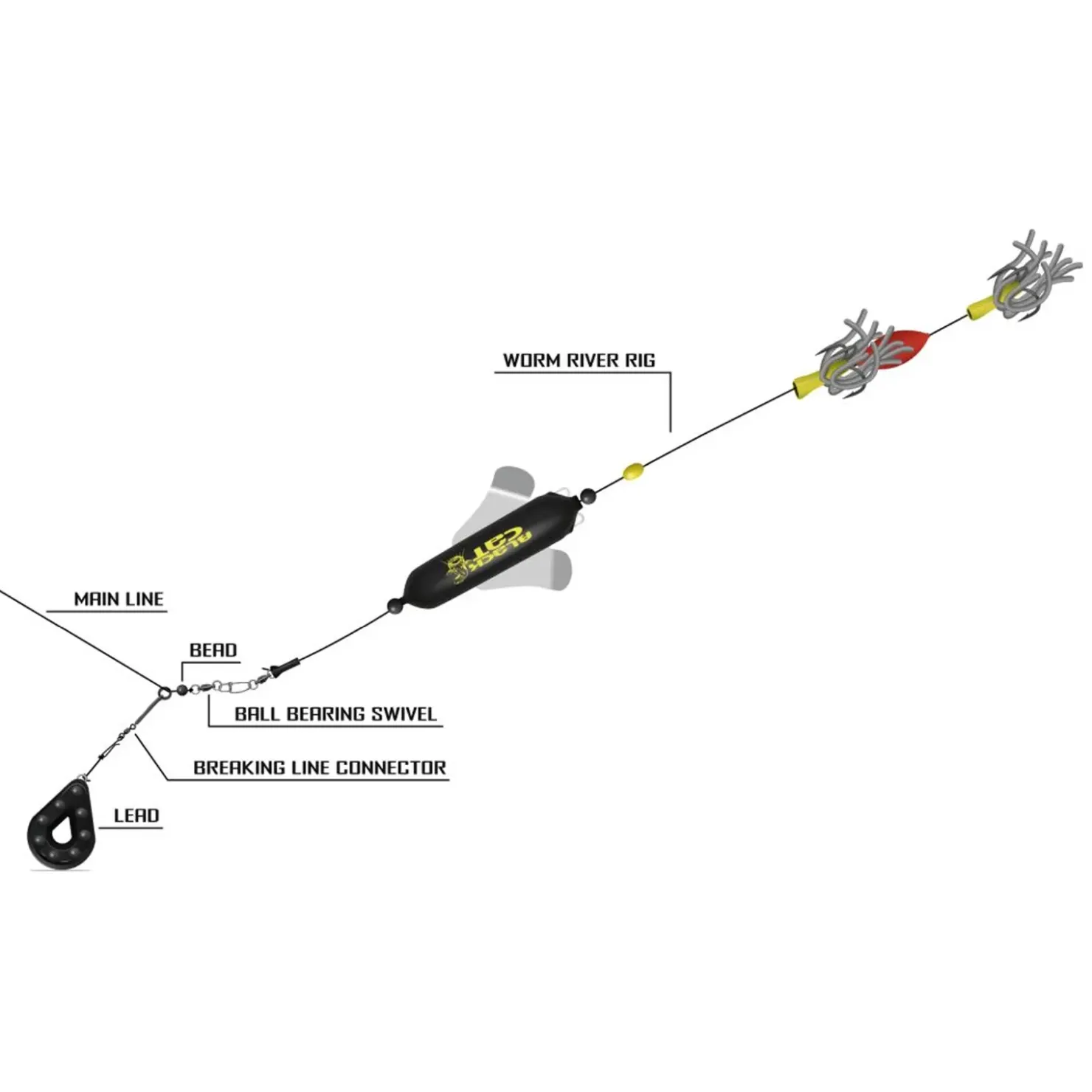Das Black Cat Worm River Rig Waller Spezial Fertigvorfach gilt als wahrer Radaumacher und präsentiert Naturköder knapp über Grund in strömenden Gewässern.
