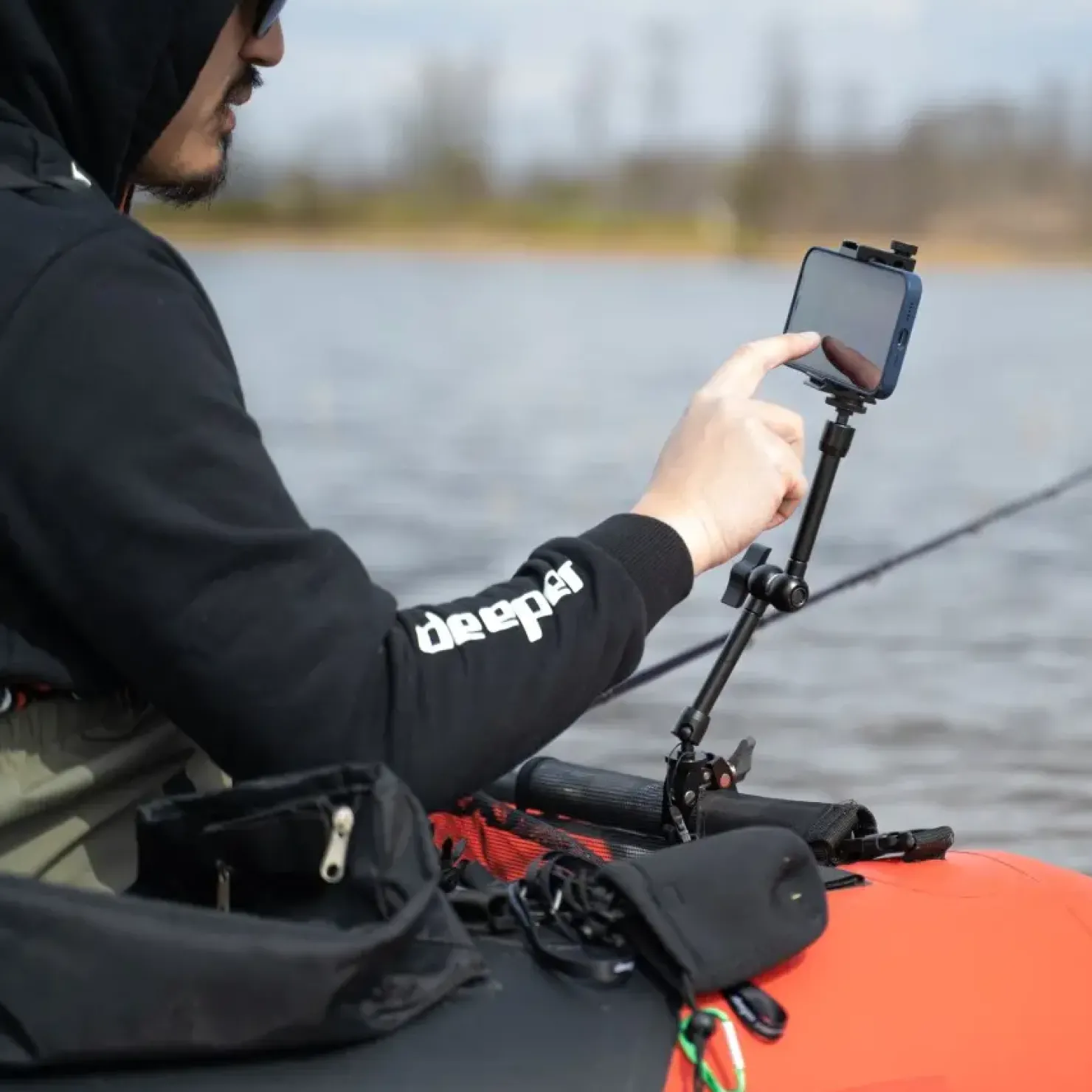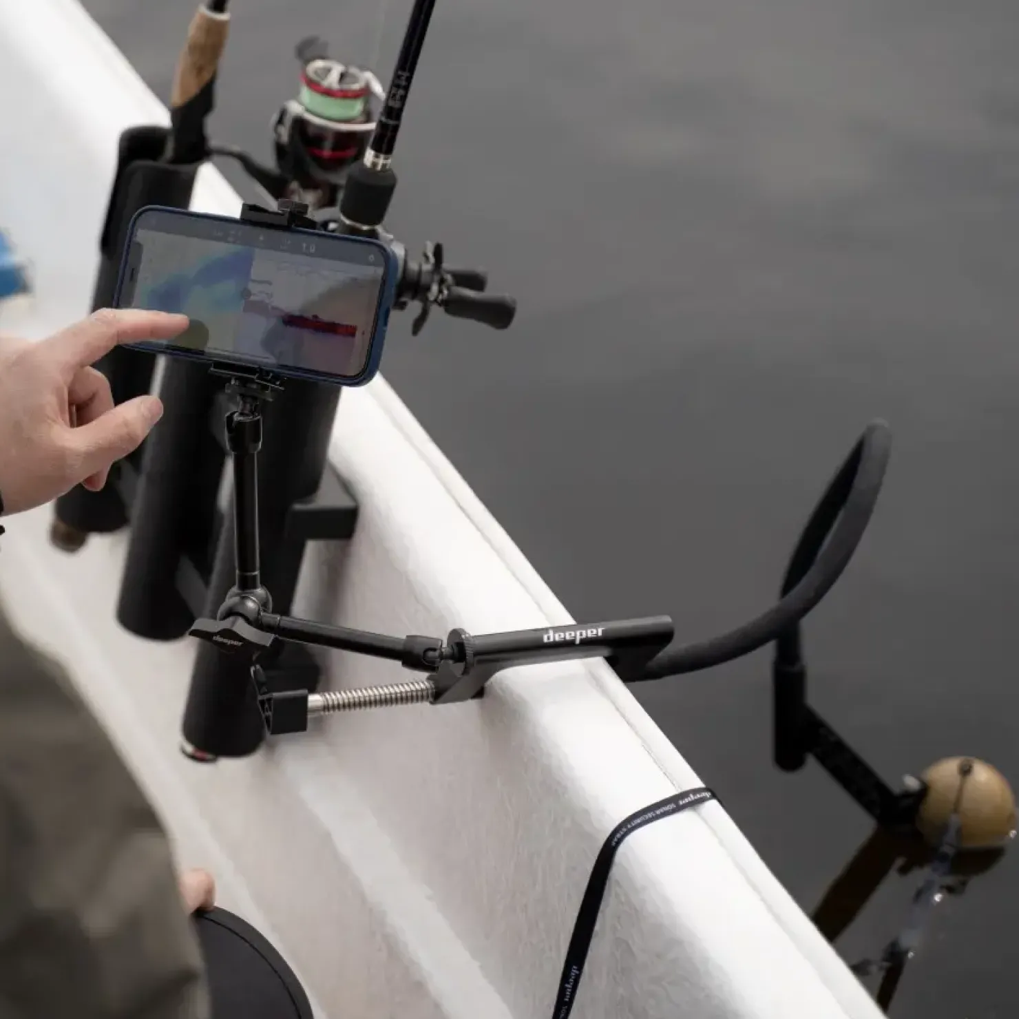 Halte dein Smartphone beim Angeln vom Boot oder Kajak aus jederzeit bequem und sicher mit dem Deeper Phone Holder für Boot und Kajak Fishfinder Zubehör in Position.