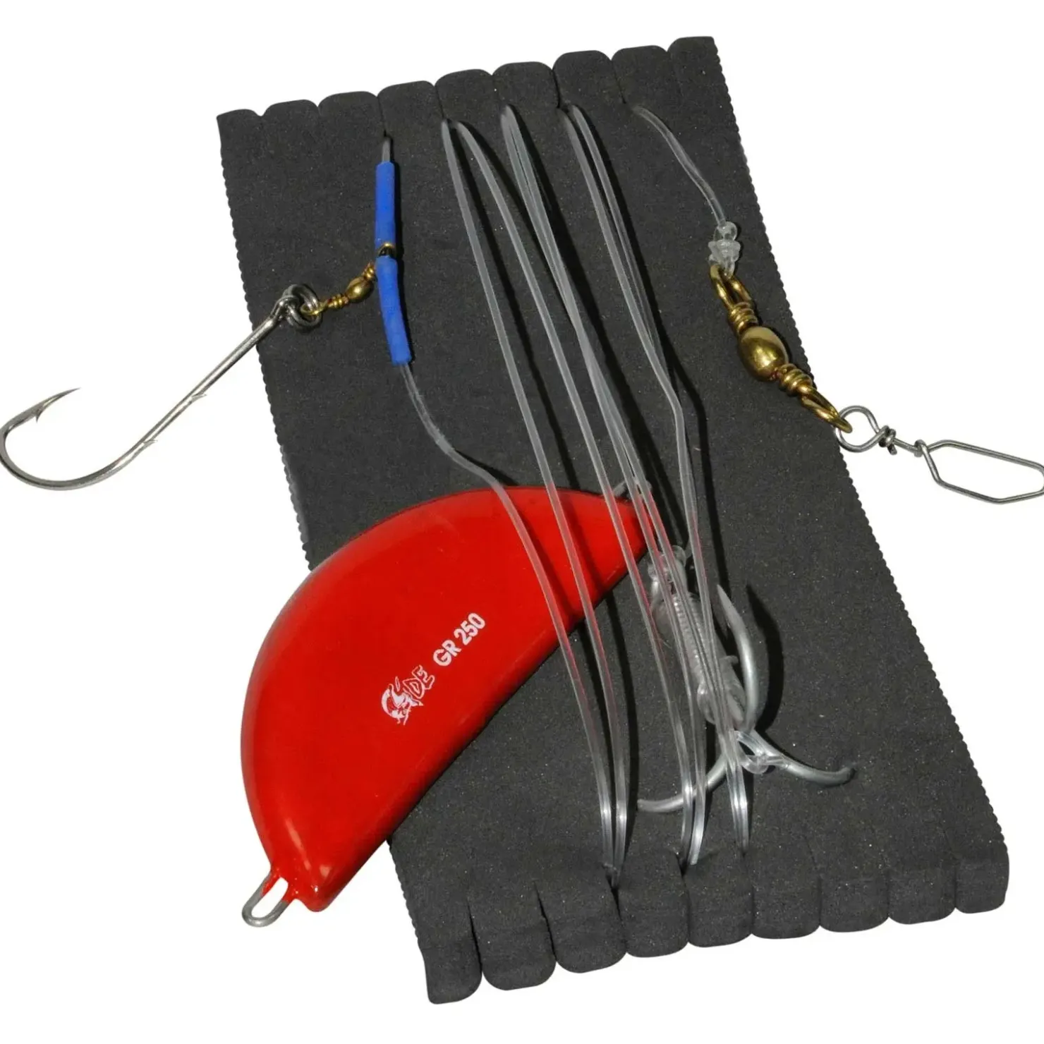 Das Kutscher System von Eisele ist speziell für den Einsatz mit einem ganzen Köderfisch entwickelt. Es ist mit seiner 1,2mm monofilen Schnur extrem hoch belastbar und nimmt mit seinem großen Drilling den Köderfisch und den Zielfisch sicher auf. Der vorgeschaltete Sicherungshaken ist als Gleithaken montiert und kann somit der Ködergröße angepasst werden. Dieses System wird mit Kutscherblei geliefert, das für eine verwicklungsfreie Präsentation sorgt.