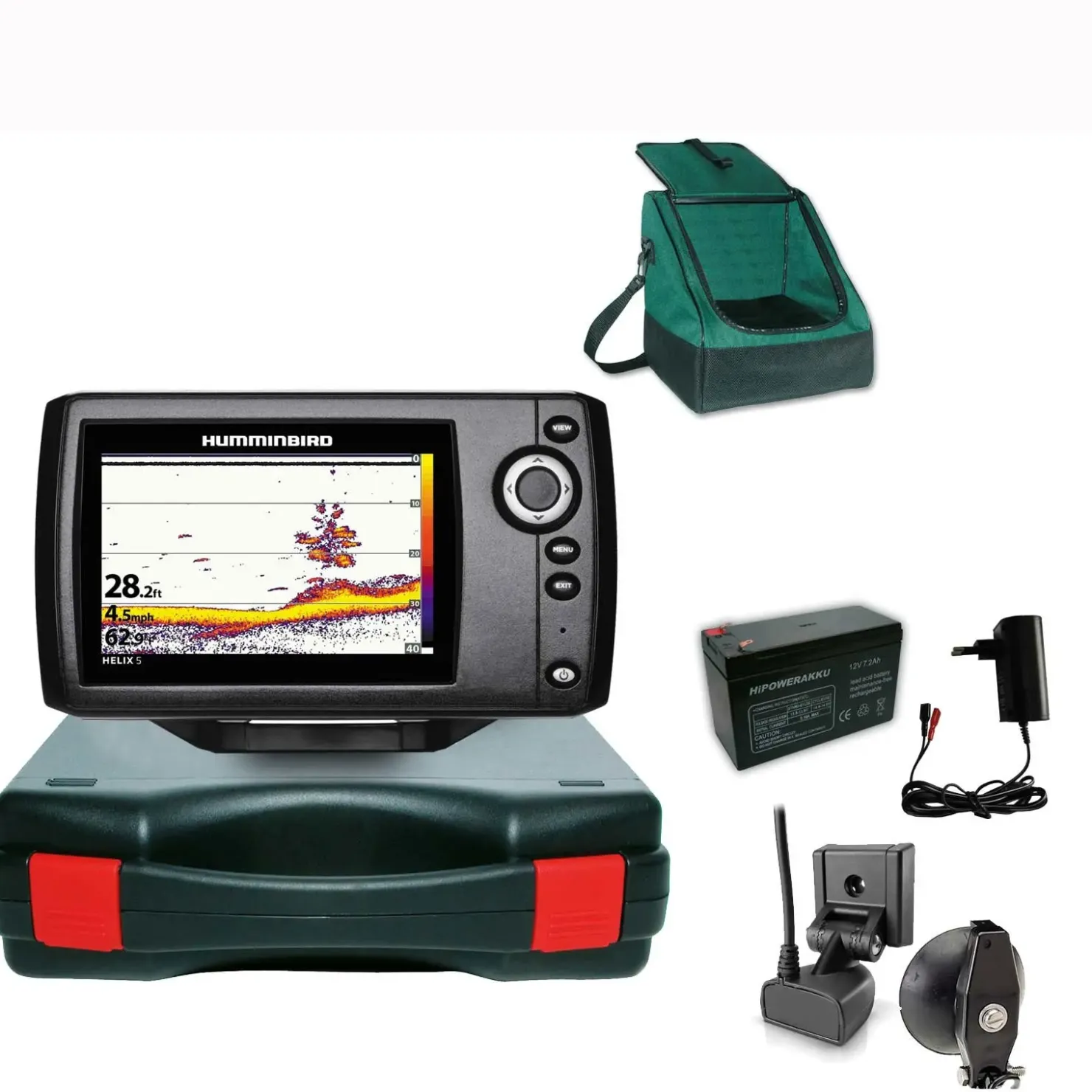 | Humminbird Helix 5 Sonar Echolot G2 Portabel Basic Plus Komplettsystem Der Lieferumfang dieses professionellen Komplettsystems – speziell für Boote mit breitem Bootsheck / Seitenwand – besteht aus: