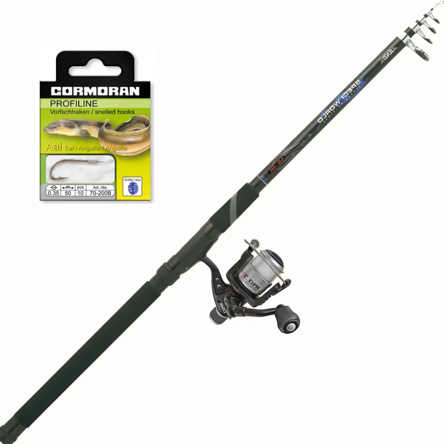 Dieses komplett Angelset besteht aus Aalrute, Angelrolle, Angelschnur und fertig gebundenen Aalhaken.